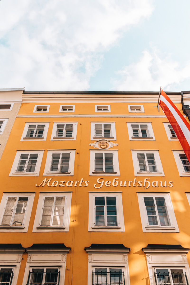 Das berühmteste Haus der Getreidegasse befindet sich an Hausnummer 9: Mozarts Geburtshaus. Zu jeder Tageszeit (von den Abendstunden einmal abgesehen) versammeln sich vor dem Haus Menschentrauben, um die orange Fassade zu bestaunen und zu fotografieren. Mozarts Geburtshaus kann übrigens besichtigt werden (kostenloser Eintritt mit der Salzburg Card – siehe unten).