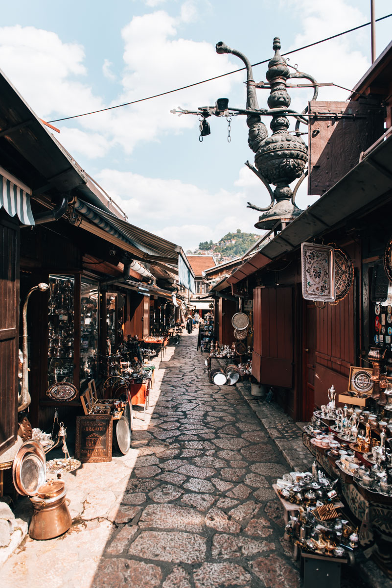 Wenn du das erste Mal durch die Gassen der Baščaršija flanierst, dann wirst du wirklich sofort an einen Basar denken: Die niedrigen Häuser, die gepflasterten Gässchen, der Duft nach Holzkohle – man fühlt sich wie in einer anderen Welt!