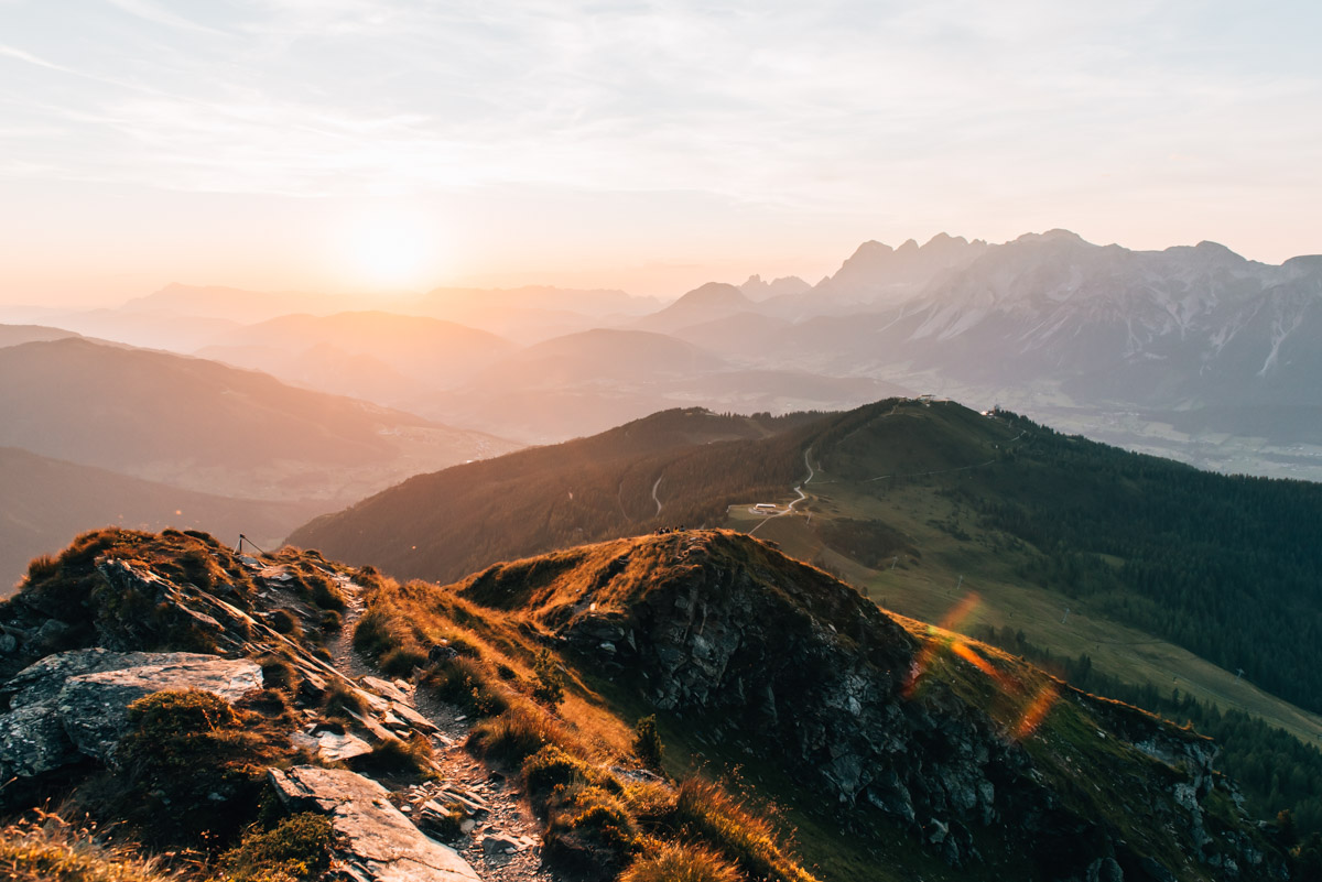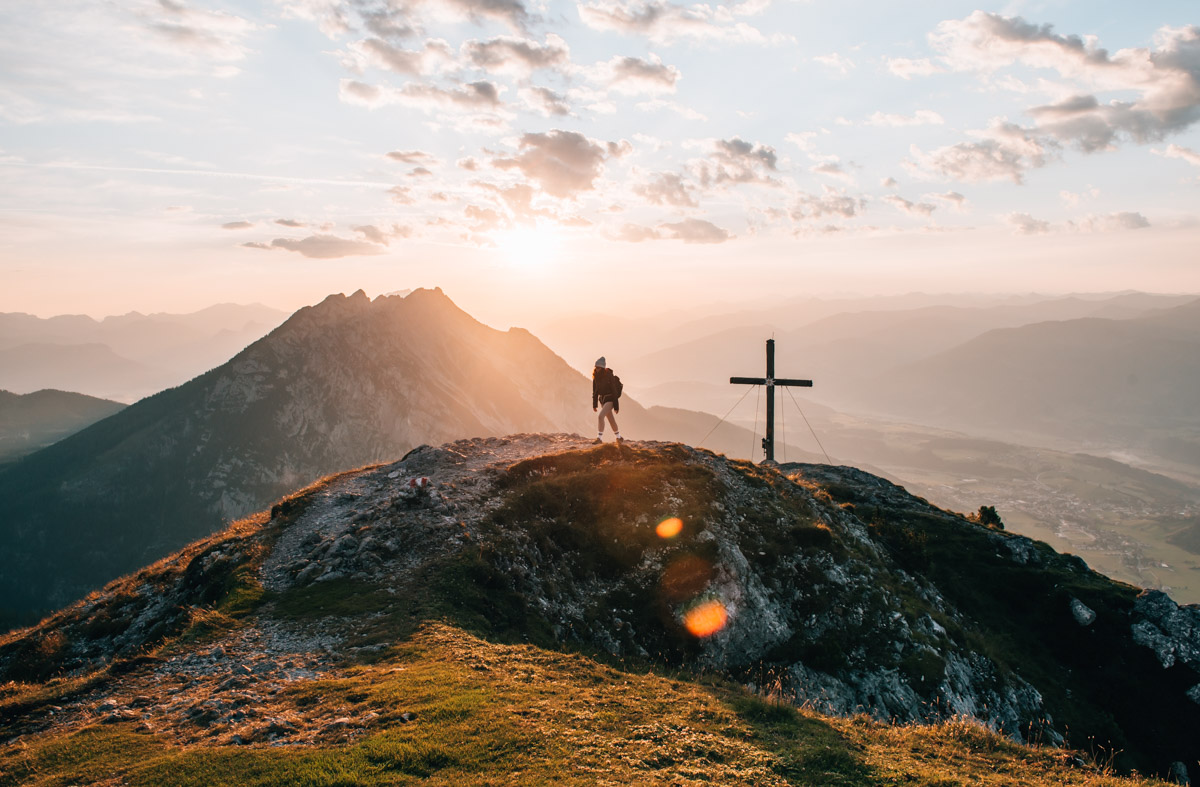 Vom Gipfel genießt du einen sagenhaften 360-Grad-Blick hinab ins Tal und Richtung Berge. Das Morgenlicht schenkt der Naturkulisse ein ganz spezielles Flair. Eindrucksvoll fanden wir persönlich auch das sonnenerleuchtete Dachsteinmassiv.