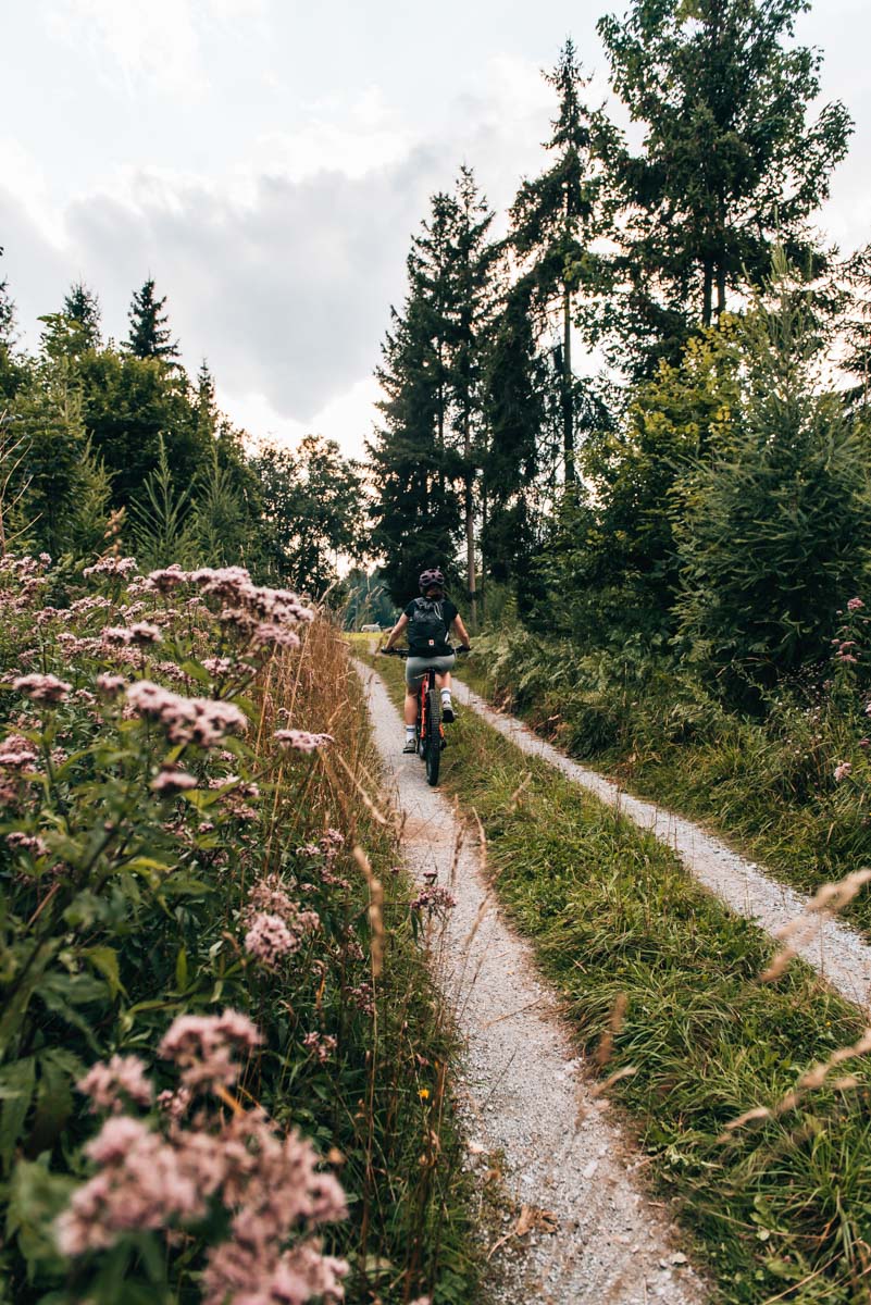 Gut zu wissen: „Flow“ bedeutet übrigens, dass es recht fließend, mit ungefähr gleichbleibender Geschwindigkeit dahingeht. Es gibt keine Hindernisse wie Wurzeln oder große Steine. Die Oberfläche erinnert also eher an einen schmalen Schotterweg. Generell sind Flowtrails so gebaut, dass auch Einsteiger*innen sie problemlos befahren können.