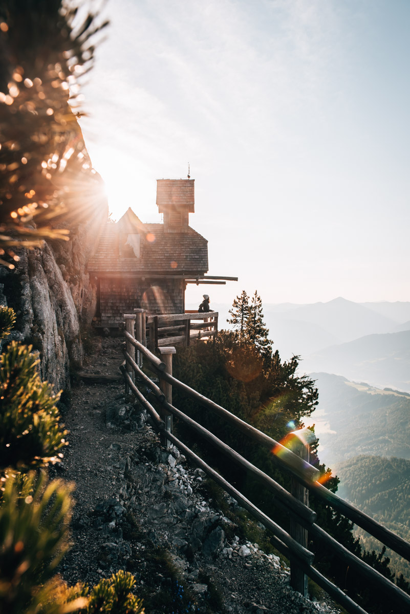 Nach dem Sonnenaufgang empfehlen wir unbedingt einen Abstecher zum Friedenskircherl. Diese kleine Kapelle thront an einem Abhang und ist von der Abzweigung beim Peter-Rosegger-Denkmal in ungefähr 10 Minuten erreichbar.