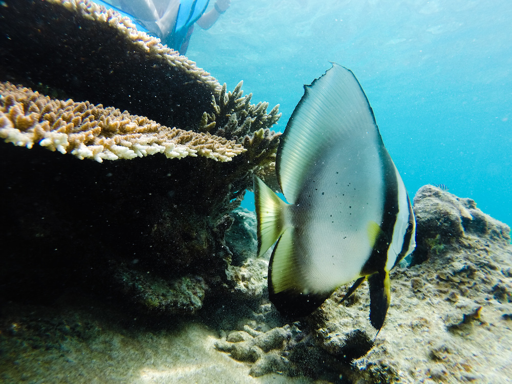 Viele Menschen treten mit ihren Schwimmflossen direkt auf die Korallen. Immer wieder – man mag es nicht für möglich halten! Wenn du Schwimmflossen trägst, dann achte bitte doppelt und dreifach darauf, dass du genügend Abstand zu den Korallen hältst.