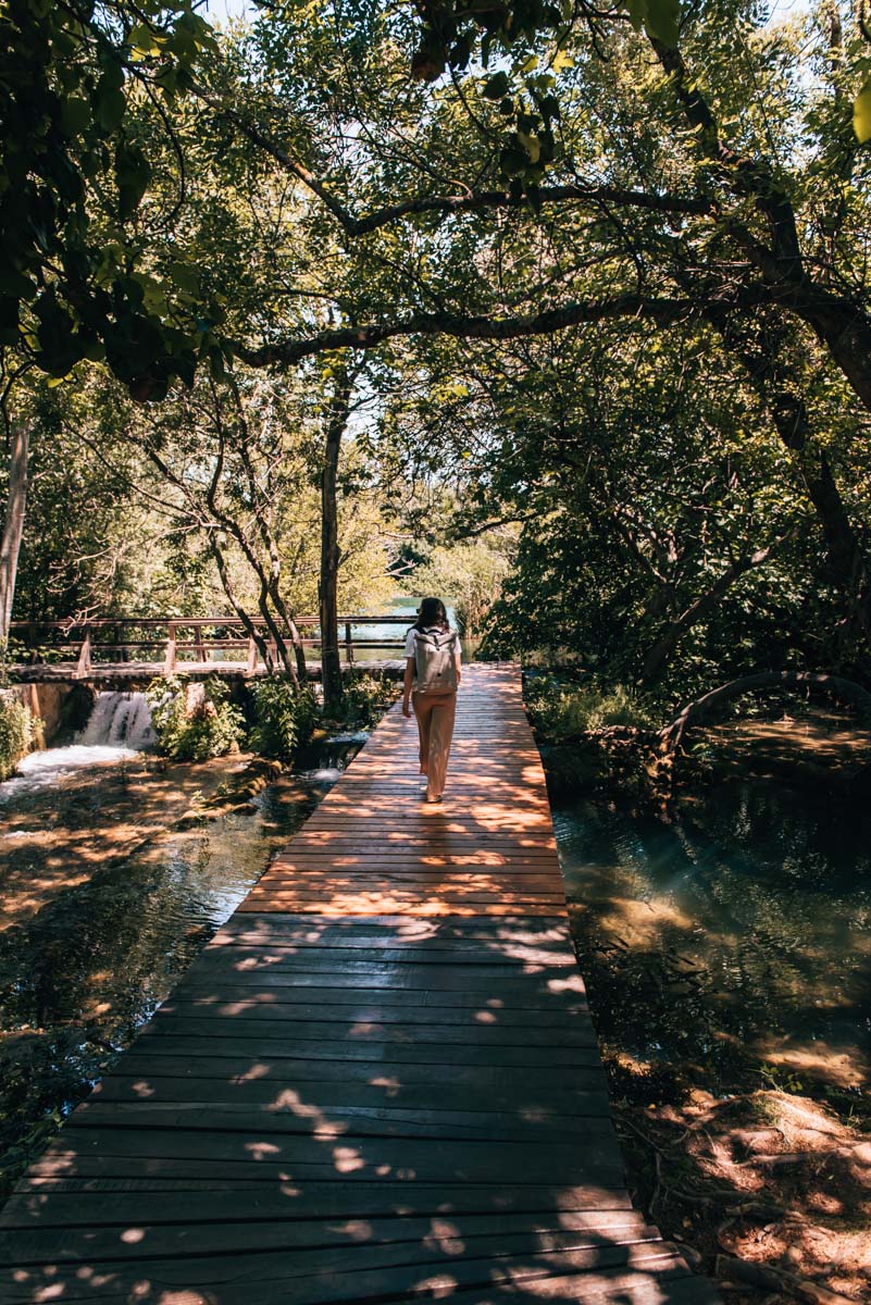 Rund um den Skradinski Wasserfall verläuft ein etwa 2 Kilometer langer Rundweg. Er führt dich meist auf Holzstegen, oft auch über Stufen durch das Naturjuwel. Du hörst das Wasser rauschen, Frösche quaken, Vögel singen – vor allem, wenn wenig los ist, ist der Spaziergang wirklich atemberaubend schön. Immer wieder darfst du dich auf spektakuläre Ausblicke freuen.