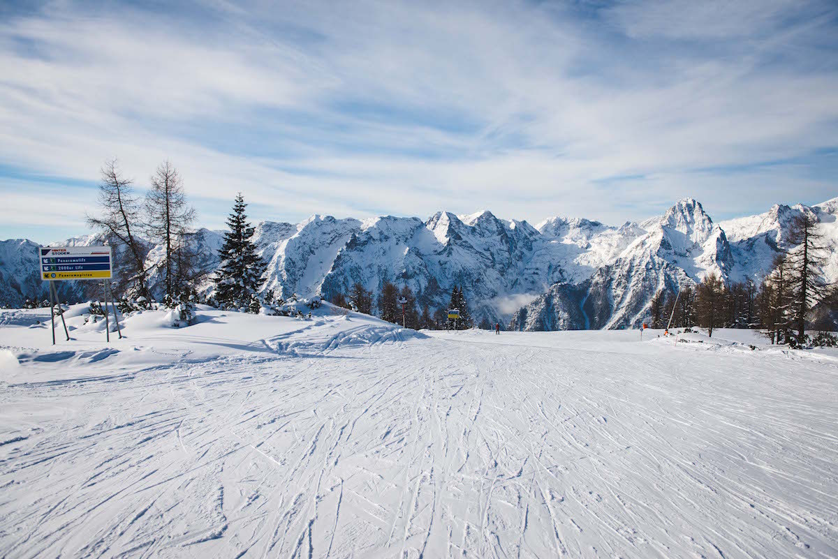 Und das Tolle dabei: Das Skigebiet Hinterstoder ist überraschend alpin! Es befindet sich im Toten Gebirge. Während des Skifahrens genießt du somit Ausblicke auf die imposanten, verschneiten Felsformationen – allen voran der gewaltige Große Priel. Das Panorama ist wirklich herrlich.