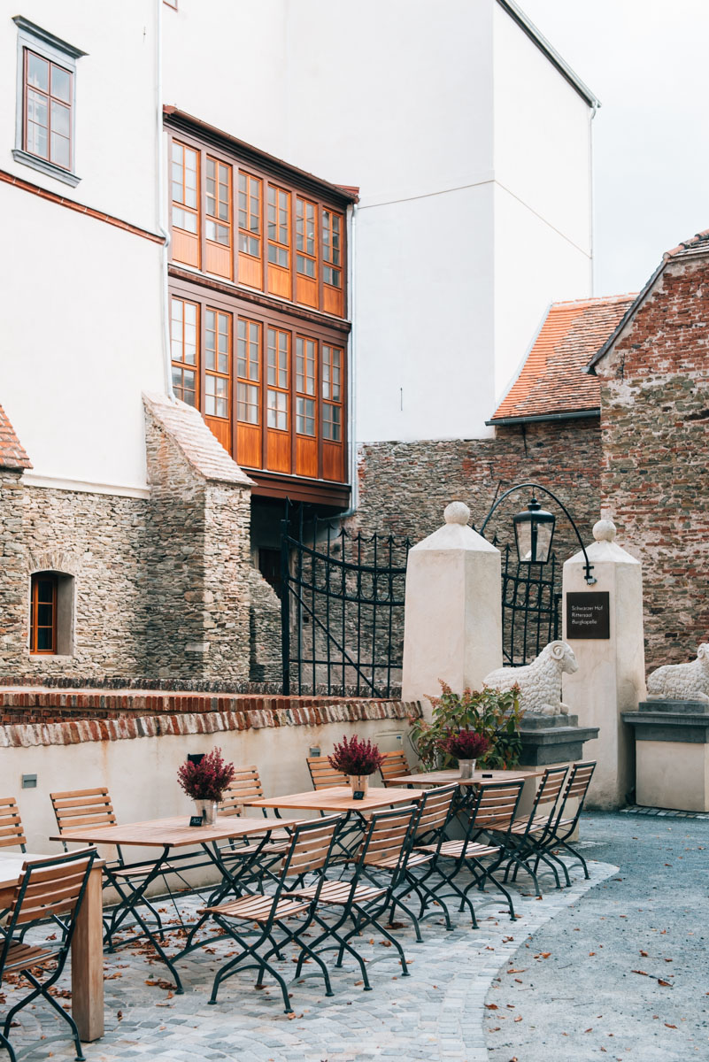Im Innenhof der Friedensburg Schlaining gelegen, bietet sich ein Besuch des dazugehörigen Bistros Das Kranich bestens für eine Stärkung nach der Besichtigung an. (Keine Sorge, falls das Wetter mal nicht so mitspielt: Man kann auch drinnen Platz nehmen.)