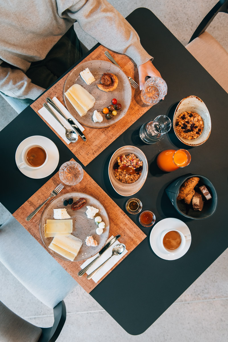 Das Frühstück wird im Bistro im Haupthaus serviert. Hier gibt’s alles, was man sich so wünscht – und noch viel mehr (Zimtschnecken, köstliches Granola, sehr gutes Brot). Auch das reduzierte Design mit dem vielen Holz und Glas vermittelt ein angenehmes Flair, sodass man hier wirklich angenehm und entspannt in den Tag starten kann.