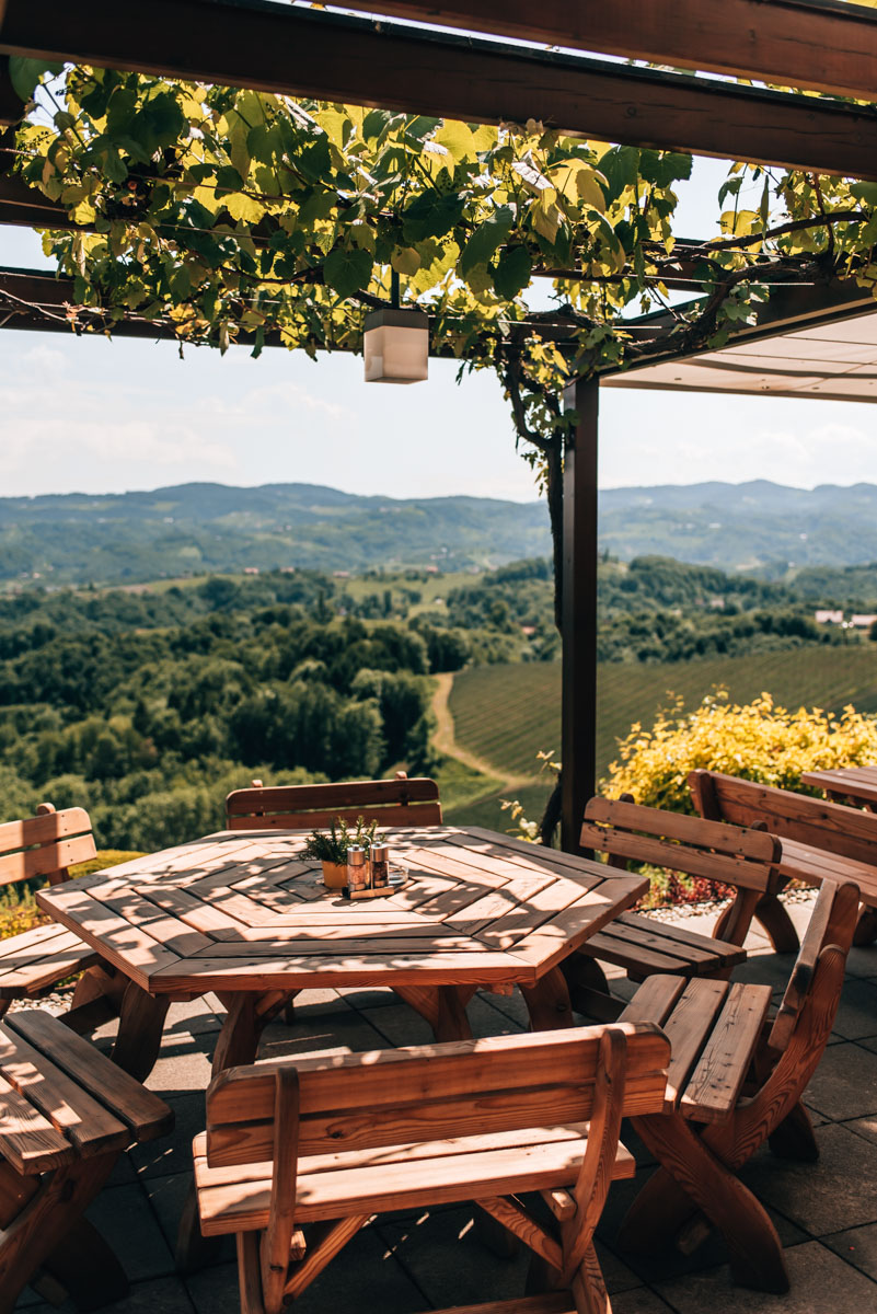 Restaurant Mahorko: Allein für den Ausblick lohnt sich ein Besuch im Restaurant Mahorko. Von der Terrasse hast du einen der schönsten Fernblicke in der Südsteiermark.