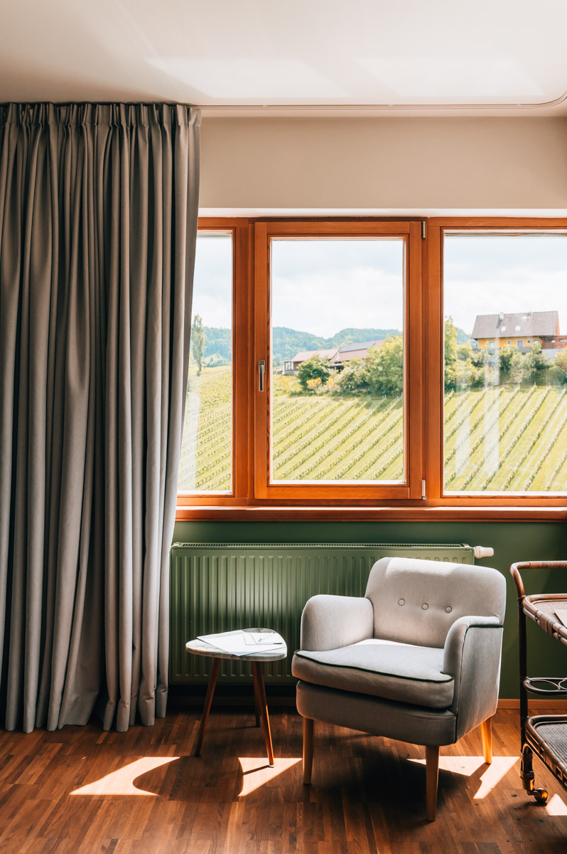 Apropos Zimmer: Diese sind sehr hell und puristisch eingerichtet – uns persönlich schon fast ein wenig zu steril, aber das ist Geschmackssache. Kleiner Tipp: Falls du einen schönen Ausblick über die Weingärten genießen möchtest, dann solltest du zumindest die Kategorie „Prestige“ buchen.