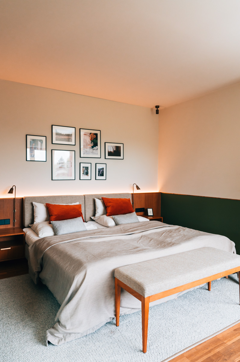 Die Zimmer sind schick eingerichtet, mit viel Holz und Naturfarben – wir haben uns richtig wohl gefühlt. Die Betten sind super bequem, das Bad ist ebenfalls sehr toll. Insgesamt gibt es 38 Zimmer. Das Hotel hat dadurch eine sehr angenehme Größe. Nicht zu klein, nicht zu groß – genau richtig.