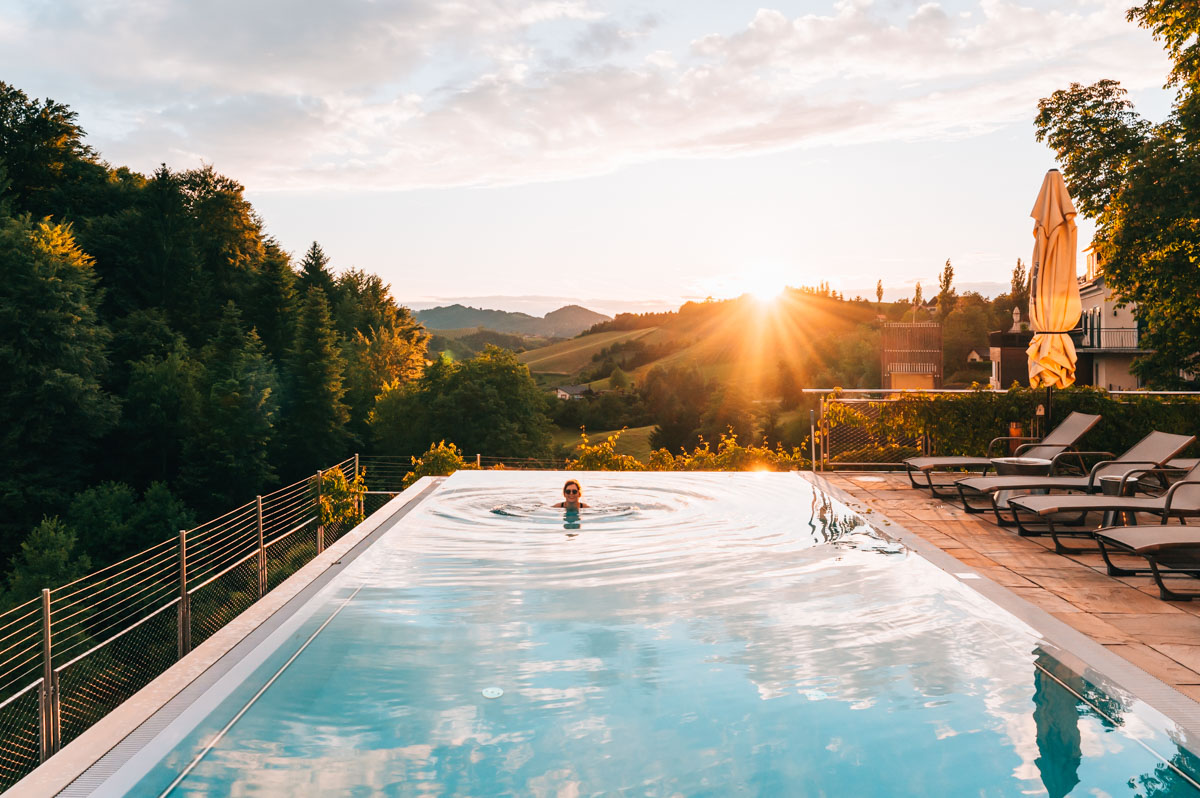 Zum Hotel gehört auch ein kleiner, aber feiner Wellnessbereich. Dessen Herzstück ist der beheizte Infinity Pool mit Blick in die Weinberge. Die Lage des Hotels ist übrigens perfekt: Ruhig gelegen, aber dennoch zentral, um die schönsten Ausflugsziele der Südsteiermark schnell zu erreichen.
