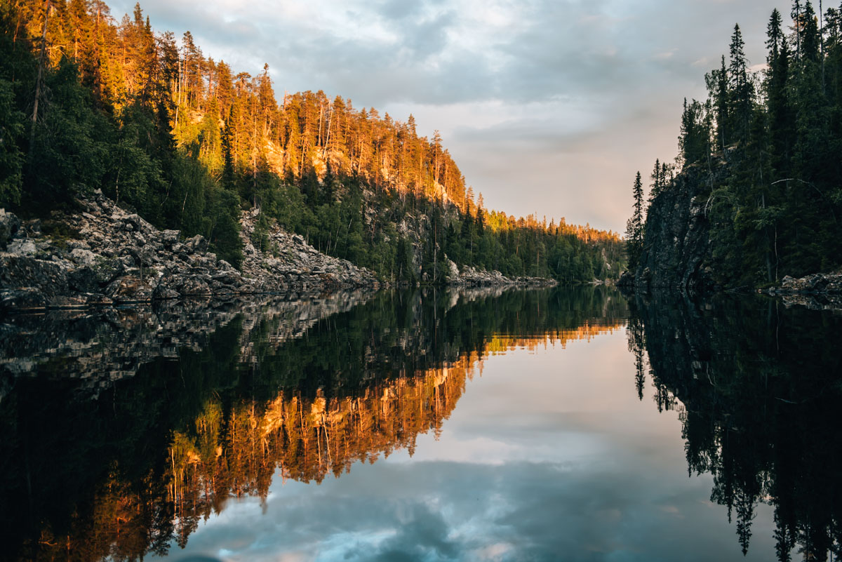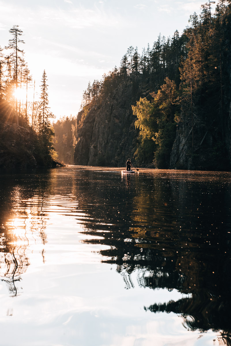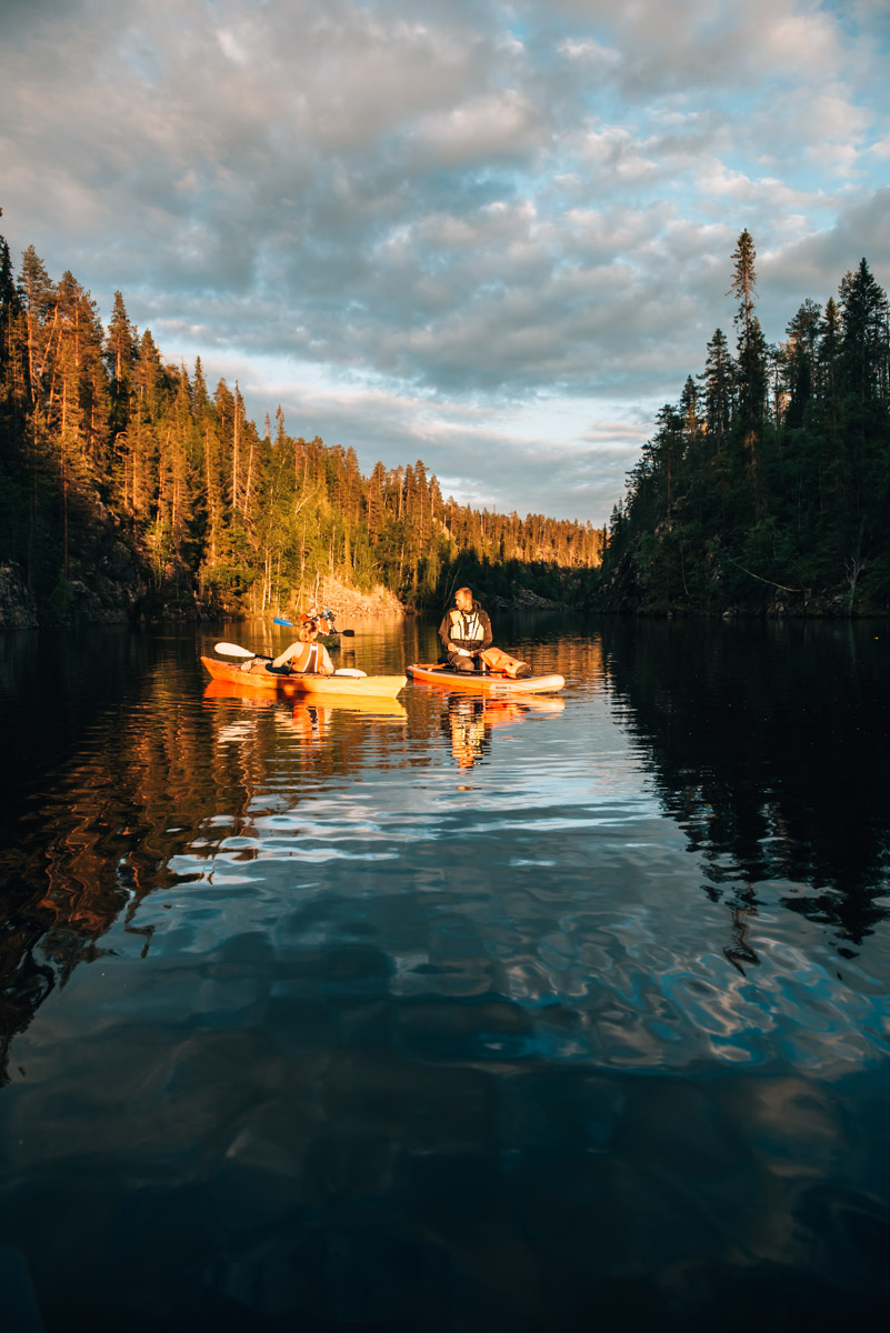 Paddeln unter der Mitternachtssonne bei einer Wahnsinns-Kulisse – wow! Der Julma-Ölkky ist ein sehr schmaler, langgezogener See im Hossa-Nationalpark. Mit den links und rechts aufragenden Steilwänden ähnelt er einem Canyon.