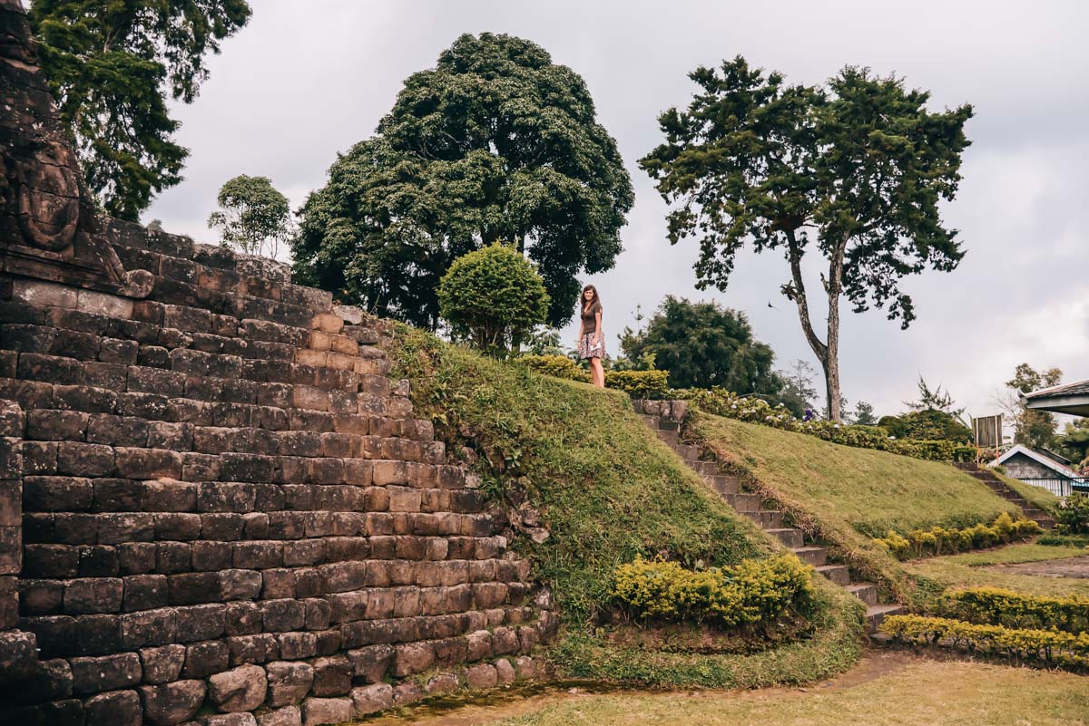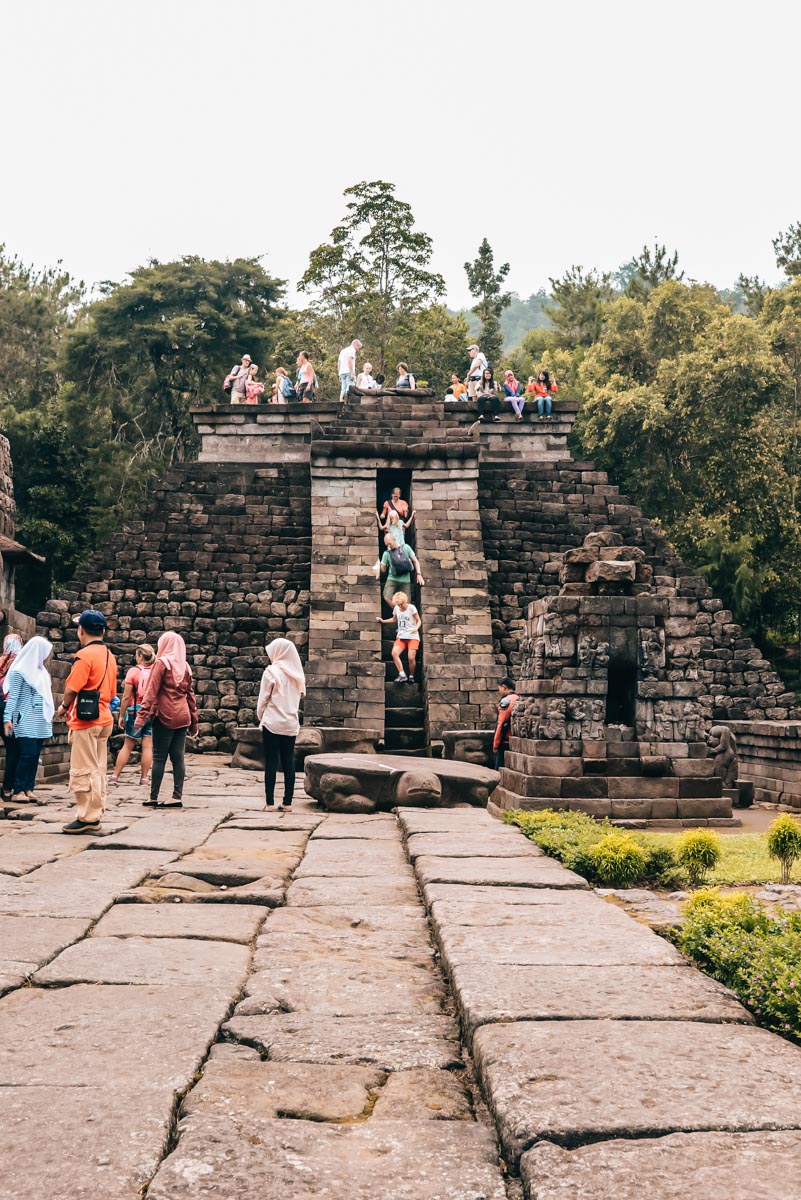 Insgesamt ist die Anlage ziemlich überschaubar, sodass der Tempel (darf erklommen werden) relativ schnell erkundet ist. Sehr gut gefallen hat uns die Lage des Tempels inmitten des saftig grünen Hinterlands Javas mit herrlichem Ausblick.