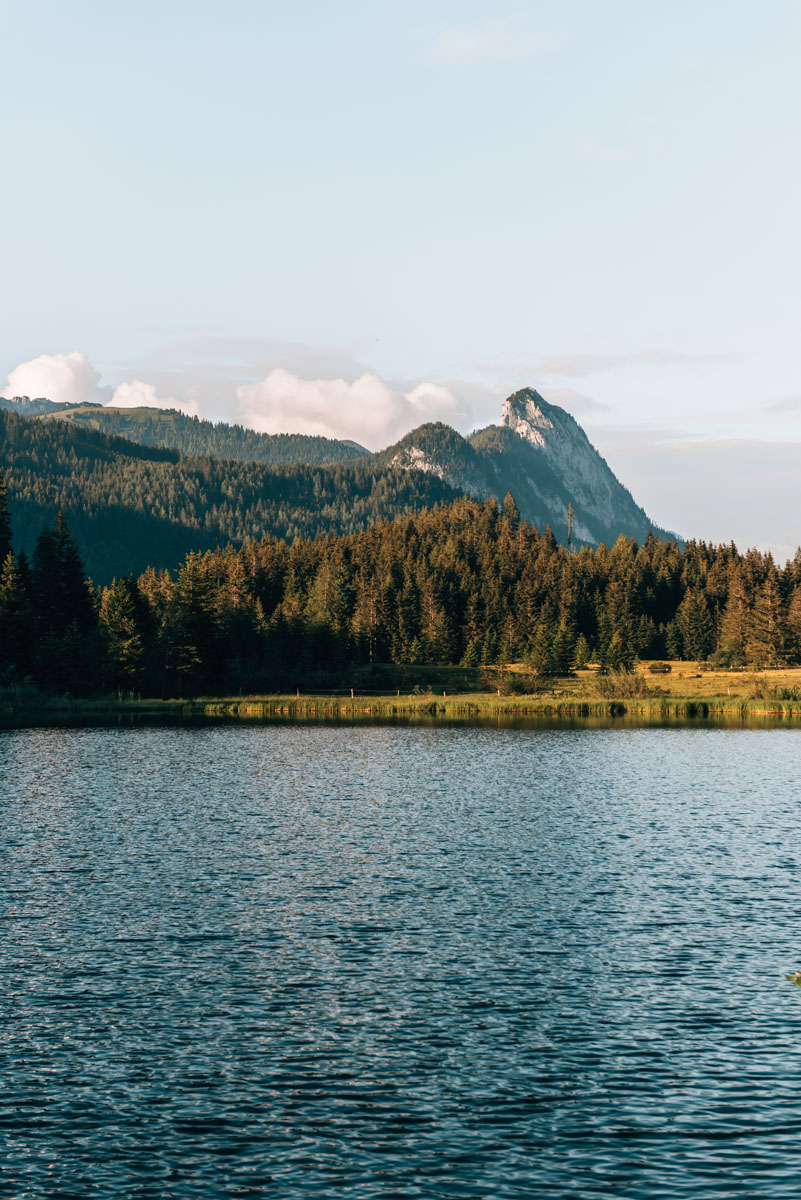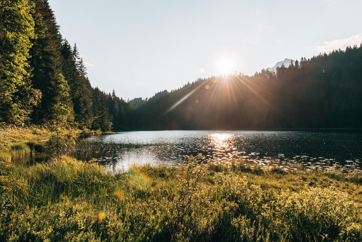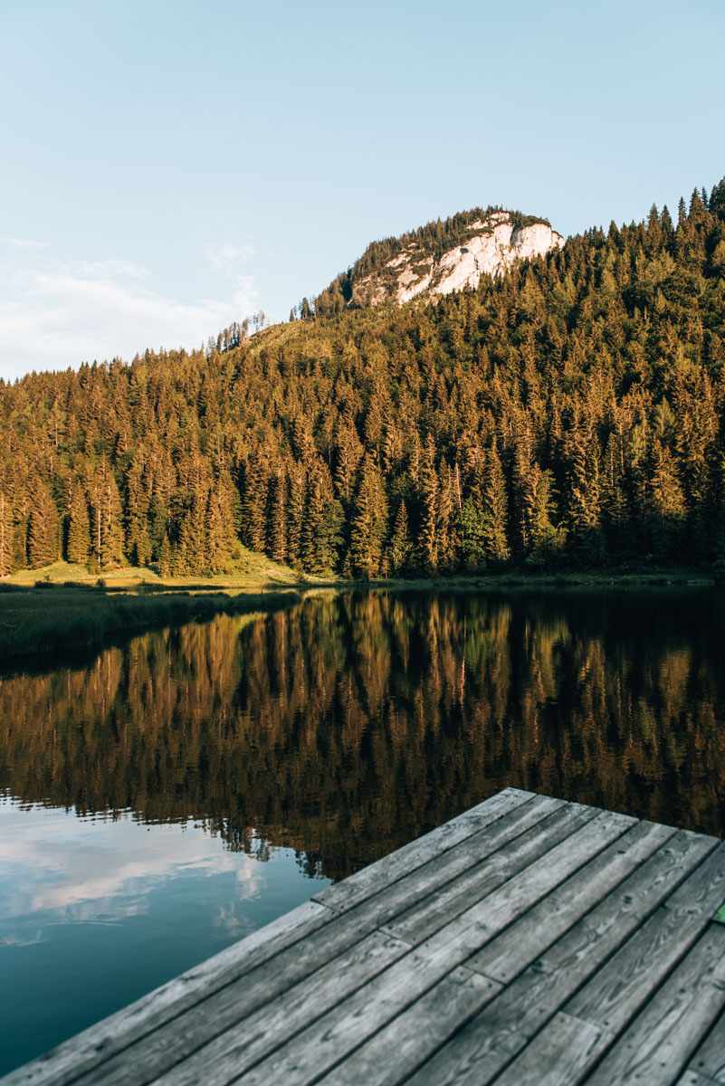 Der Spechtensee ist ziemlich klein. Du kannst ihn in nicht einmal einer halben Stunde umrunden. Ein paar Bänke laden zum Verweilen ein – der See ist wirklich ein unglaublich idyllisches Plätzchen. Anschließend lohnt sich eine Einkehr in der Spechtenseehütte.