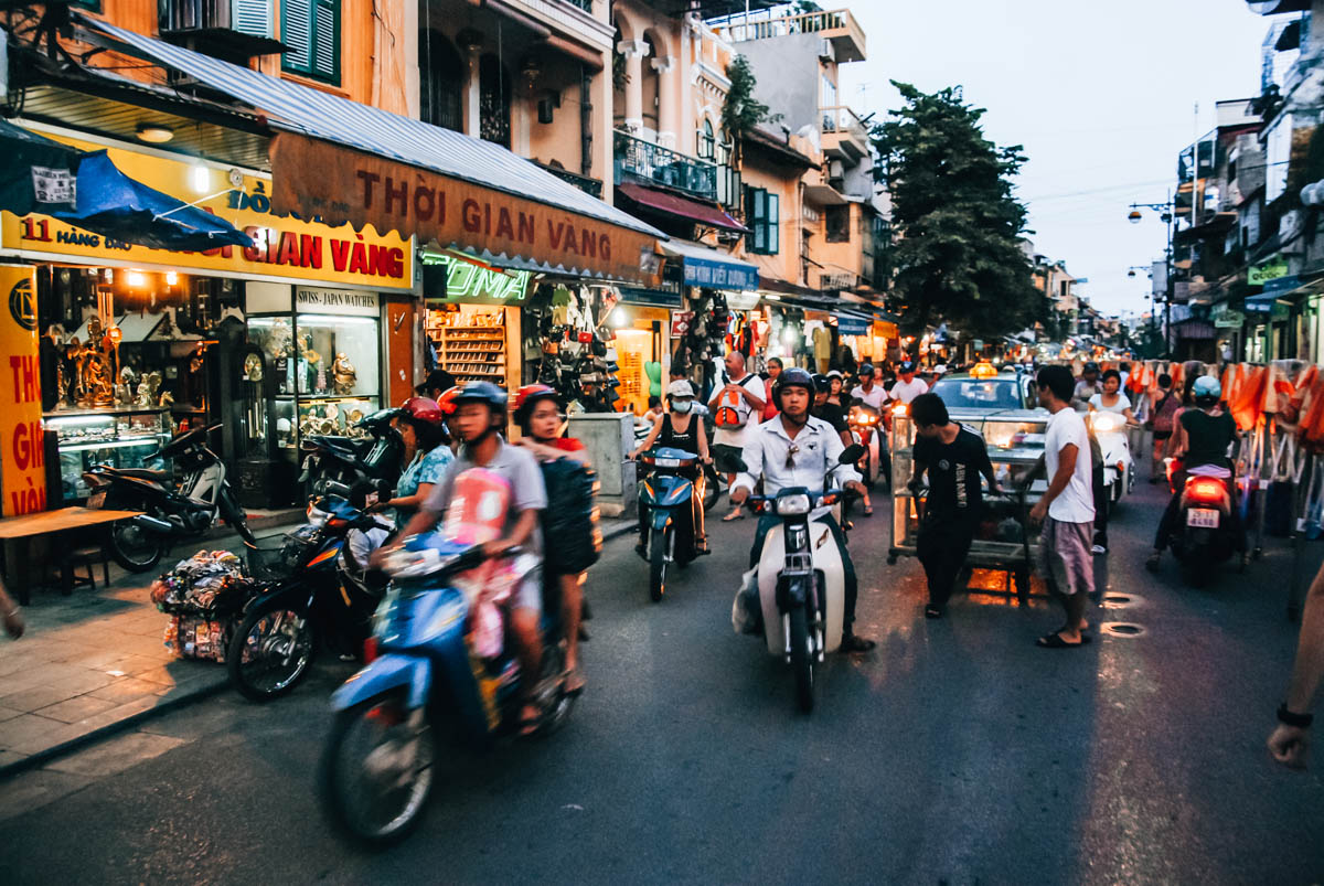 Los geht’s in der Stadt der Städte in Vietnam: Hanoi. Hanois Altstadt ist für uns der Inbegriff von Vietnam. Auf den Straßen tummeln sich Schwärme von hupenden Rollern. Von den Garküchen am Straßenrand strömen dir exotische Gerüche jeglicher Art entgegen. Und zwischendurch muss man aufpassen, die Menschen, die auf den winzigen, niedrigen Plastikschemeln sitzen, nicht zu übersehen.