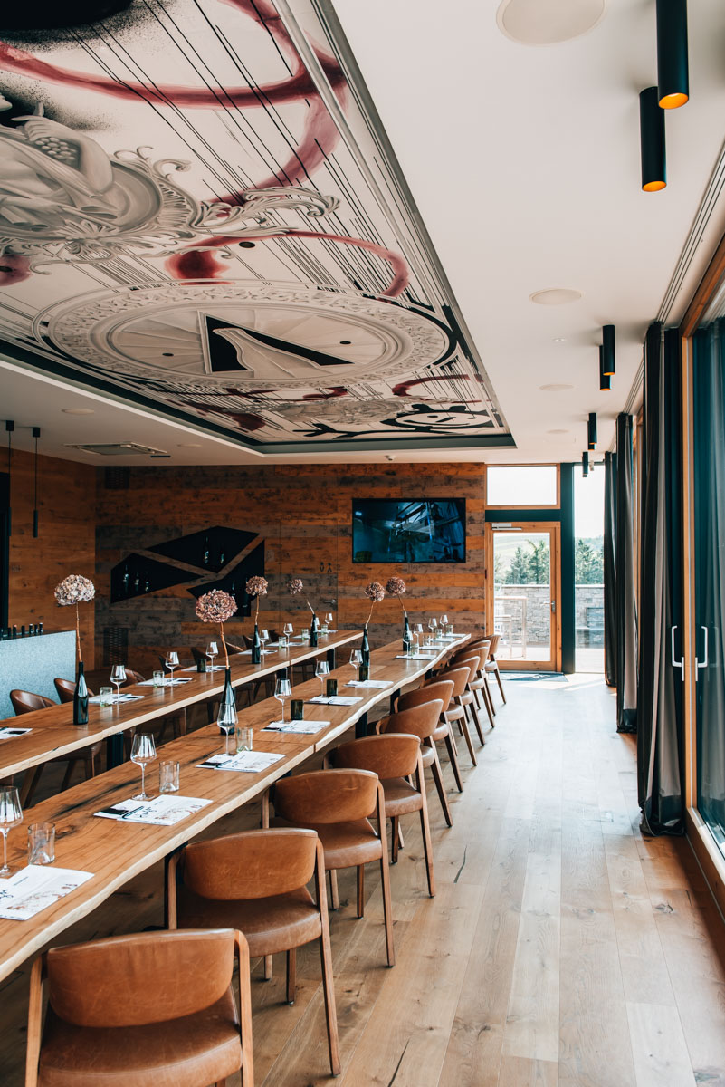 Als eine Art Kubus aus Holz und Glas thront das Weingut Hagn über dem Ortszentrum von Mailberg. Die Lage ist fantastisch und der Ausblick ebenso. Hier lässt es sich wirklich aushalten!