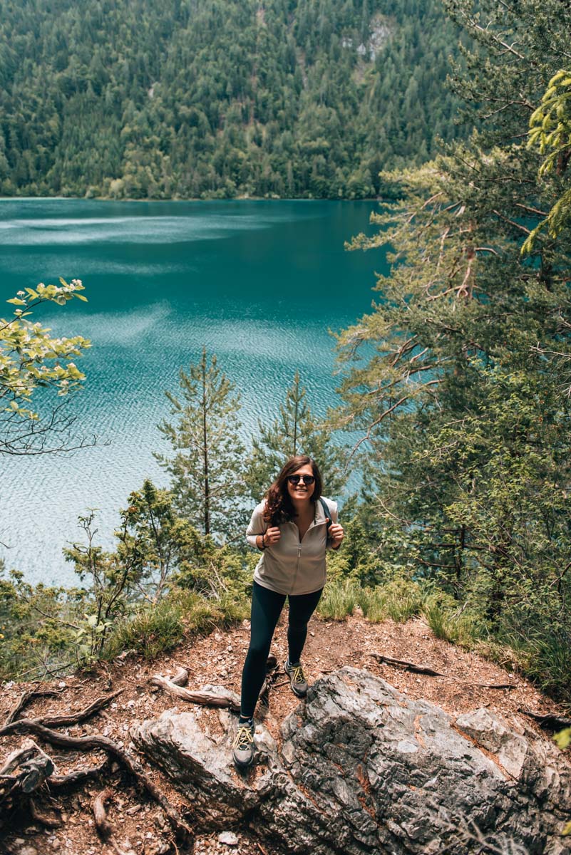 Wie weit du vom Ende des Uferwegs (Dolomitenblick) „zurück“ Richtung Westen wandern möchtest, bleibt dir überlassen. Der erste Streckenabschnitt (Dolomitenblick bis Steinwand) verläuft teils flach, teils steil. Du sammelst also auch einige Höhenmeter und hast immer wieder grandiose Ausblicke auf den Weissensee. (An dieser Stelle ein Hinweis: Vom Schild „Nur für geübte Wanderer geeignet“ solltest du dich nicht abhalten lassen. Sofern du halbwegs trittsicher und schwindelfrei bist, ist der Weg wirklich machbar. Wir würden aber empfehlen, den Weg nur bei gutem Wetter zu gehen. Die nassen Wurzeln der Bäume können sonst sehr rutschig sein.) Plane für diesen Abschnitt etwa 1,5 Stunden ein.