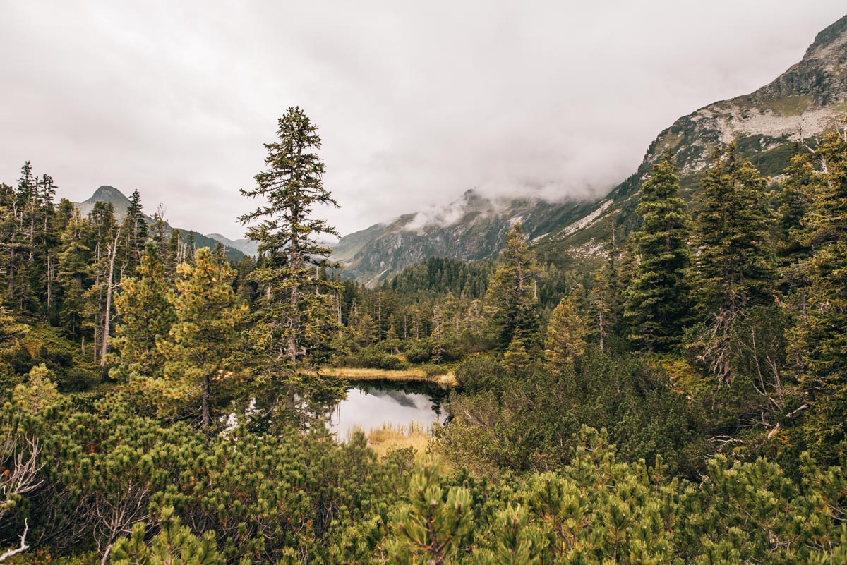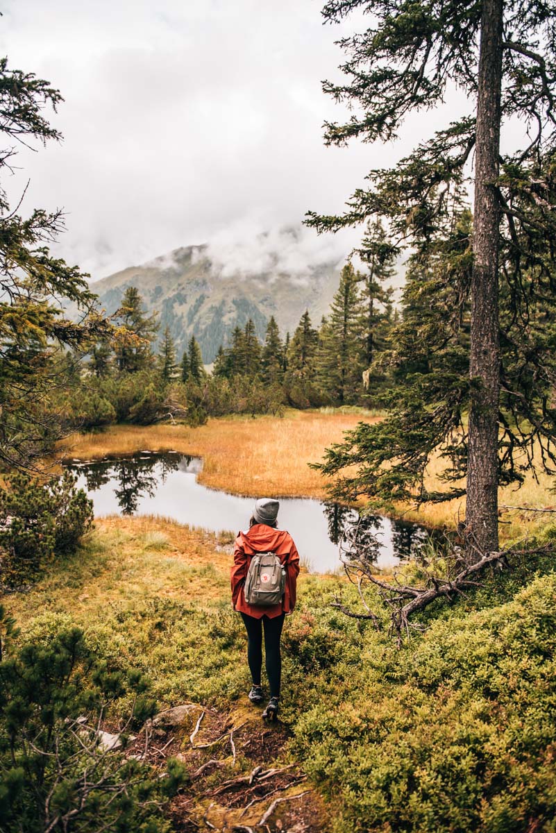Kommen wir zum Landschaftserlebnis in Perfektion: der Wanderung durch den Wiegenwald. Vier Stunden haben wir in dieser urwaldartigen Moorlandschaft verbracht und möchten keine einzige Sekunde davon missen. Ohne zu übertreiben, aber in puncto Natur kann mit dieser Wanderung so schnell keine andere mithalten: Du wanderst durch einen naturbelassenen Wald aus Zirben, Lärchen und Fichten, vorbei an Hochmooren, Seen und: Heidelbeersträuchern. Ja, ganz recht – beinahe der gesamte Wanderweg ist von Heidelbeersträuchern gesäumt. Perfektion, wir sagen’s ja!