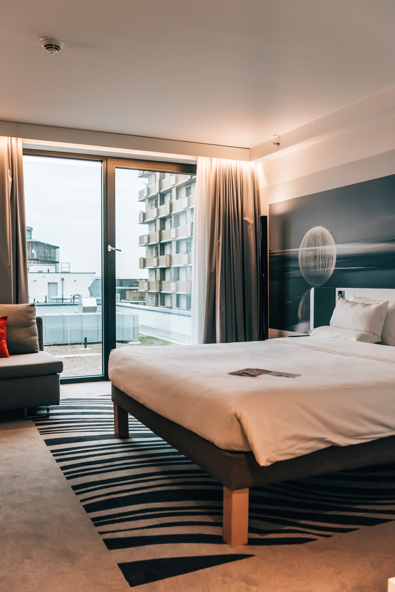 Die Zimmer sind sehr modern ausgestattet. Das Design ist nicht unser Geschmack, aber in puncto Komfort fehlt es dir hier an nichts. Das Hotel befindet sich in einem Hochhaus und das bedeutet: Von einigen Zimmern sowie vom Fitnesscenter & Spabereich im 19. Stock hast du einen tollen Ausblick über Wien.