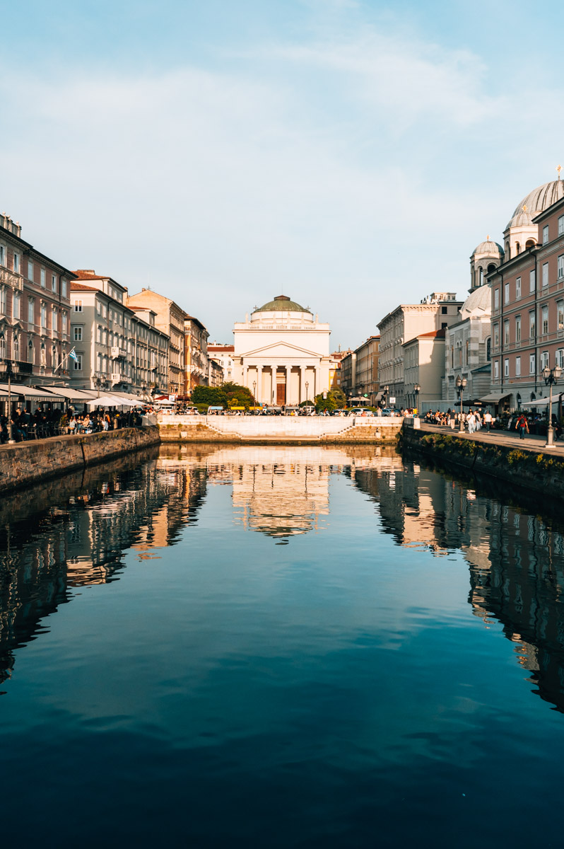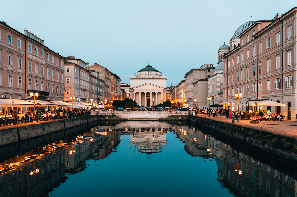 Der Kanal ist an beiden Seiten von wunderschönen Palästen und historischen Handelshäusern gesäumt. Außerdem gibt es jede Menge Restaurants und Bars, die zum Verweilen einladen. Abends geht die Sonne am Horizont im Meer unter und taucht den Canal Grande mit etwas Glück in ein warmes Licht. Am besten du kehrst in einer der Bars ein, gönnst dir einen Aperitivo und genießt das Flair von Triest.