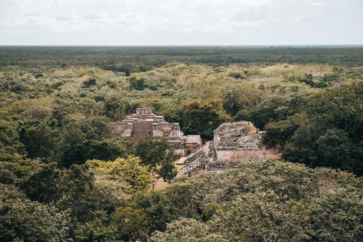 Die Ruinen von Becán darfst du erklimmen – und genau das solltest du dir nicht entgehen lassen. Von der größeren Pyramide hast du einen gigantischen Ausblick über das restliche Areal und die weitläufige Landschaft.