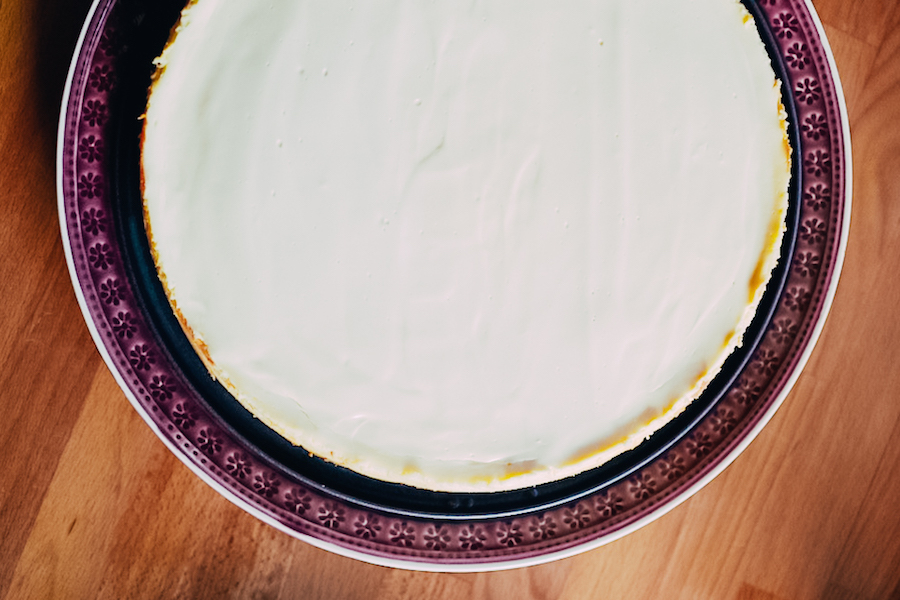 Gegen Ende der Backzeit vermengst du Creme Fraiche, Sauerrahm, Vanillezucker und etwas Zitronensaft (ein guter Esslöffel). Hol die Cheesecake aus dem Rohr und und streiche die Masse auf die Torte. Da die Cheesecake noch ganz heiß ist, kann das ein bisschen zerlaufen, das macht aber gar nichts. Und nochmal ins Rohr für weitere 5 bis 10 Minuten.
