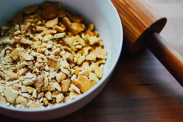 Zunächst zerbröselst du die Kekse. Ich mache das in einem Gefrierbeutel und einem Nudelholz. Schmelze die Butter langsam (z.B. in der Mikrowelle oder in einem Topf am Herd bei geringer Hitze) und vermenge diese mit den zerbröselten Keksen. Füge etwas Zimt (nicht zuviel, aber so, dass man ihn herausschmeckt) und etwas Salz hinzu und drücke die Masse auf den Boden einer Springform (meine hat einen Durchmesser von 26 cm). Diese kommt anschließend für etwa 10 Minuten ins vorgeheizte Backrohr (180 Grad Ober/Unterhitze).
